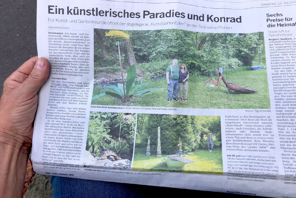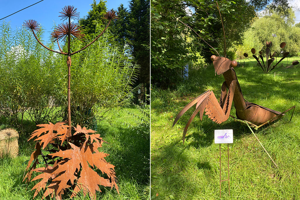 Ein Skulpturenpark und ein paradisischer Ort. Ein Fest für's Auge und die Seele. Ein Garten mit vielen Details in dem fast alles wachsen darf wie es will. In Wildblumen- und Kräuterbeeten, Staudenbeeten, Obstwiese. Gespickt mit Kunst und vor allem mit riesigen Gartenbewohnern und Pflanzen von Dianer Dille, ihres Zeichens nicht nur Stahlskulpturen-Künstlerin sondern auch begnadete Goldschmiedin im Atelier www.schmuckzeichen.de