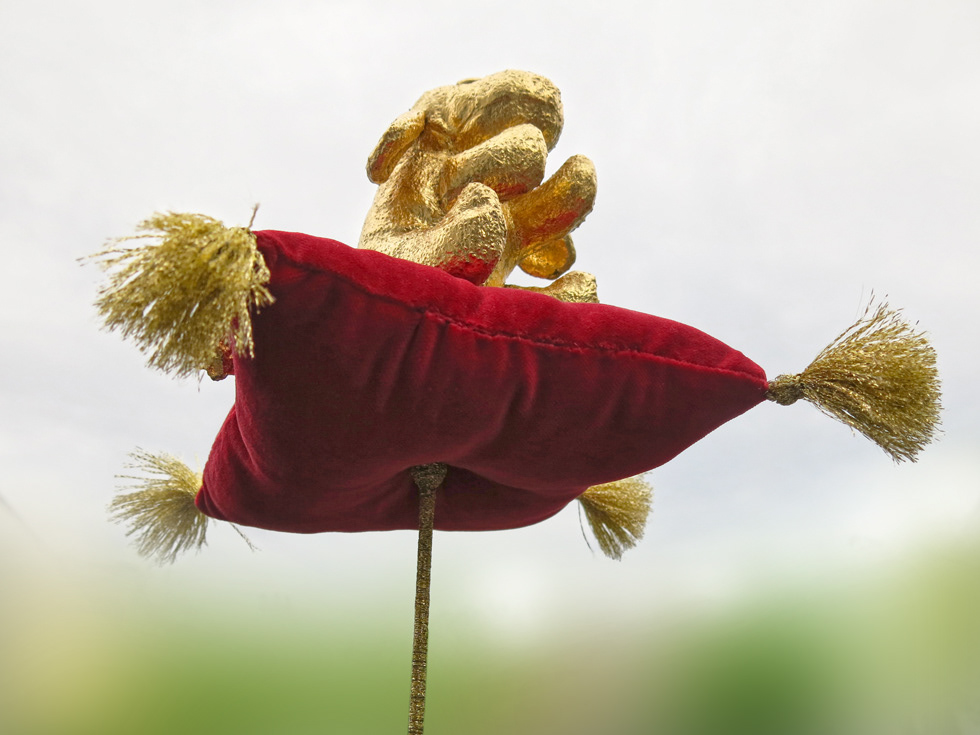 Dieser kleine Esel hat seinen Erfindern sicher schon einiges an goldenen Münzen eingebracht. Mit Recht ein Goldstück. Er sollte urspünglich auf einem Stapel Münzen sitzen. Doch er mochte lieber auf seinem fliegenden Samtkissen durch die Welt fliegen und über den Dingen sein.