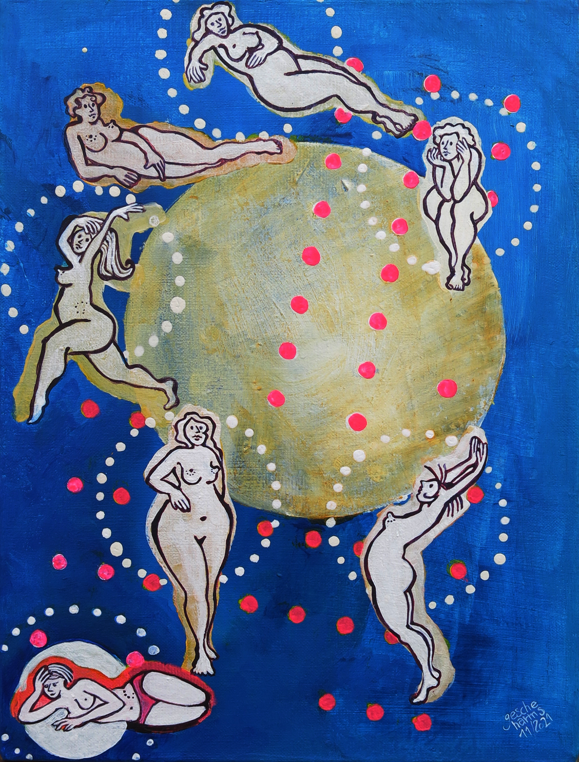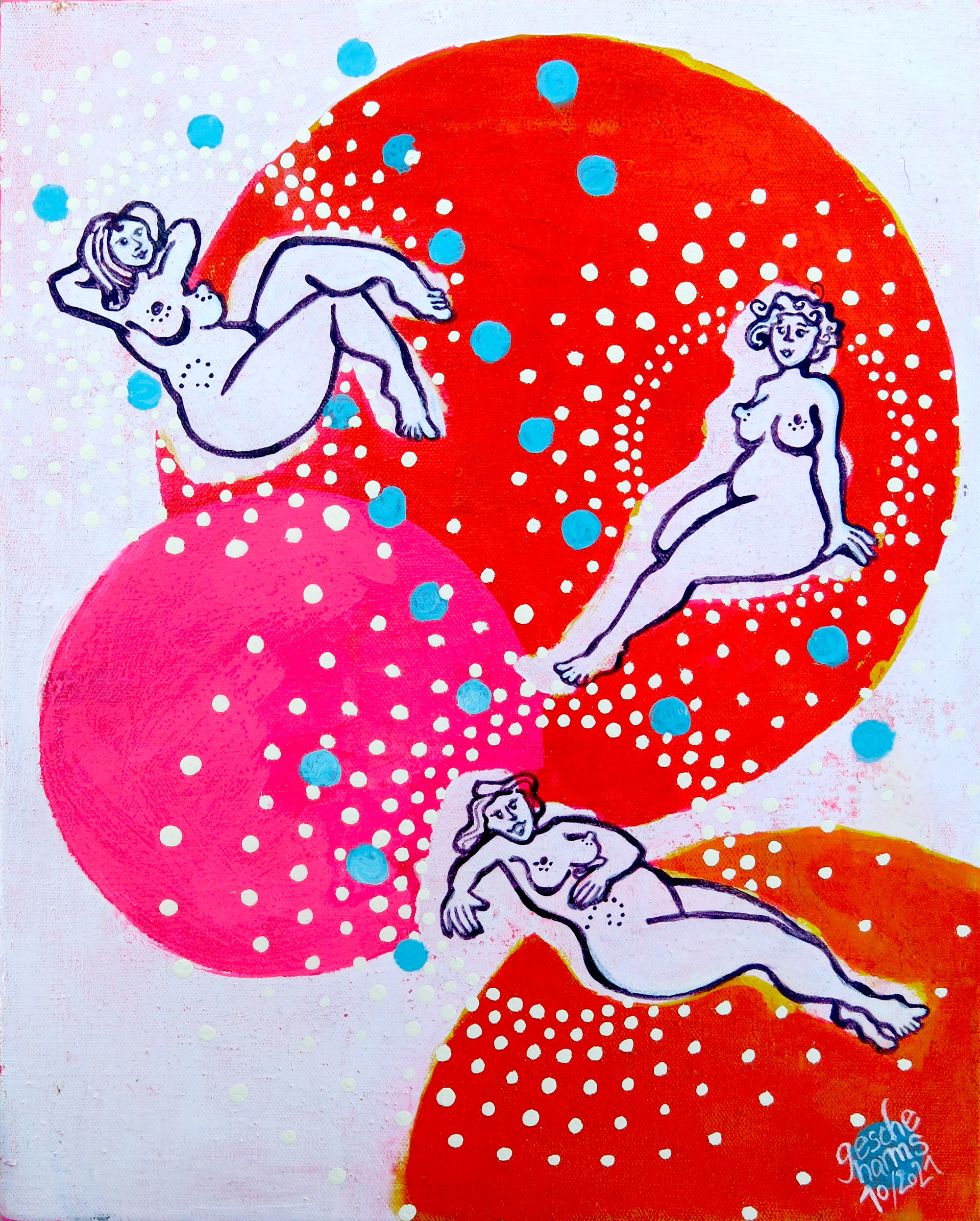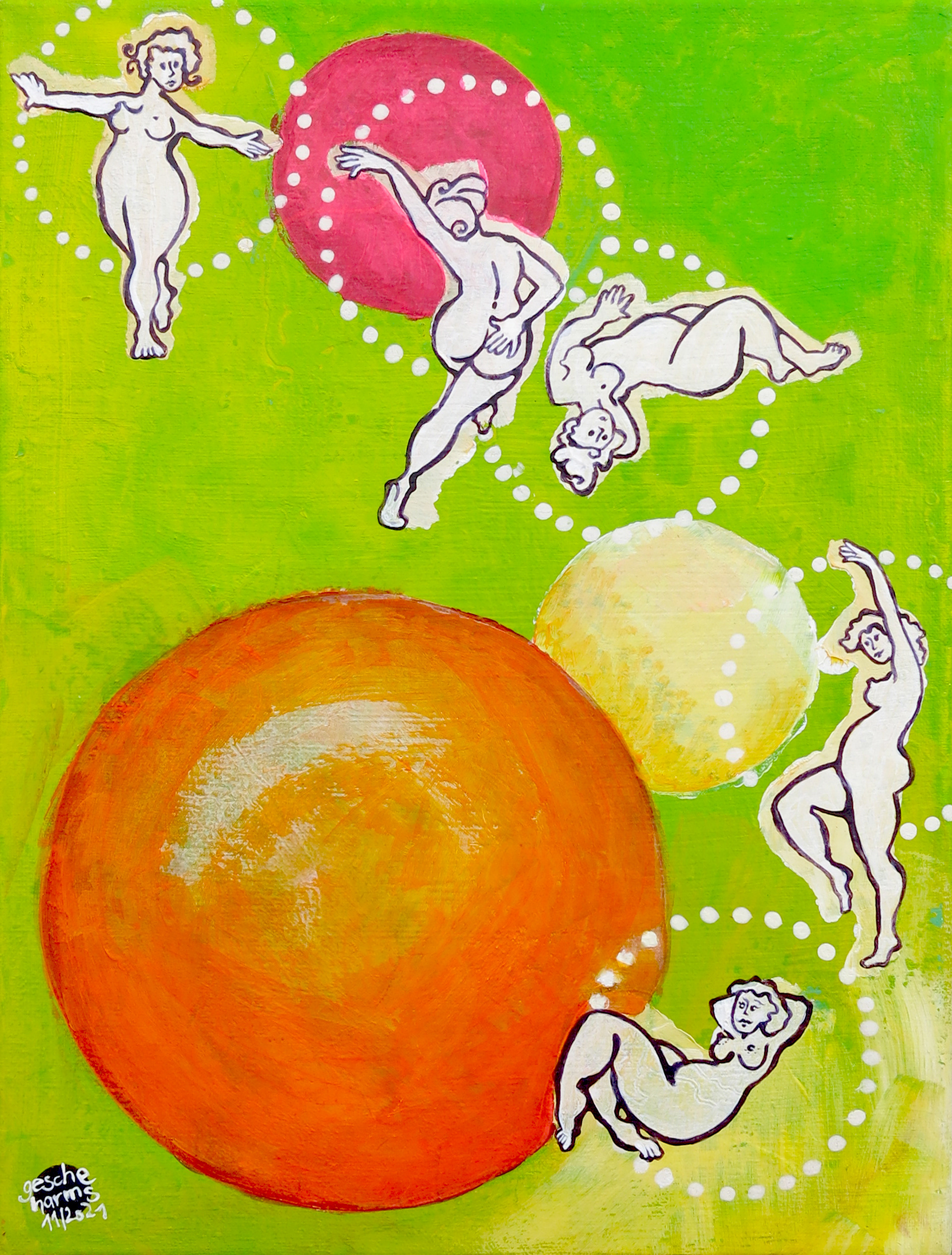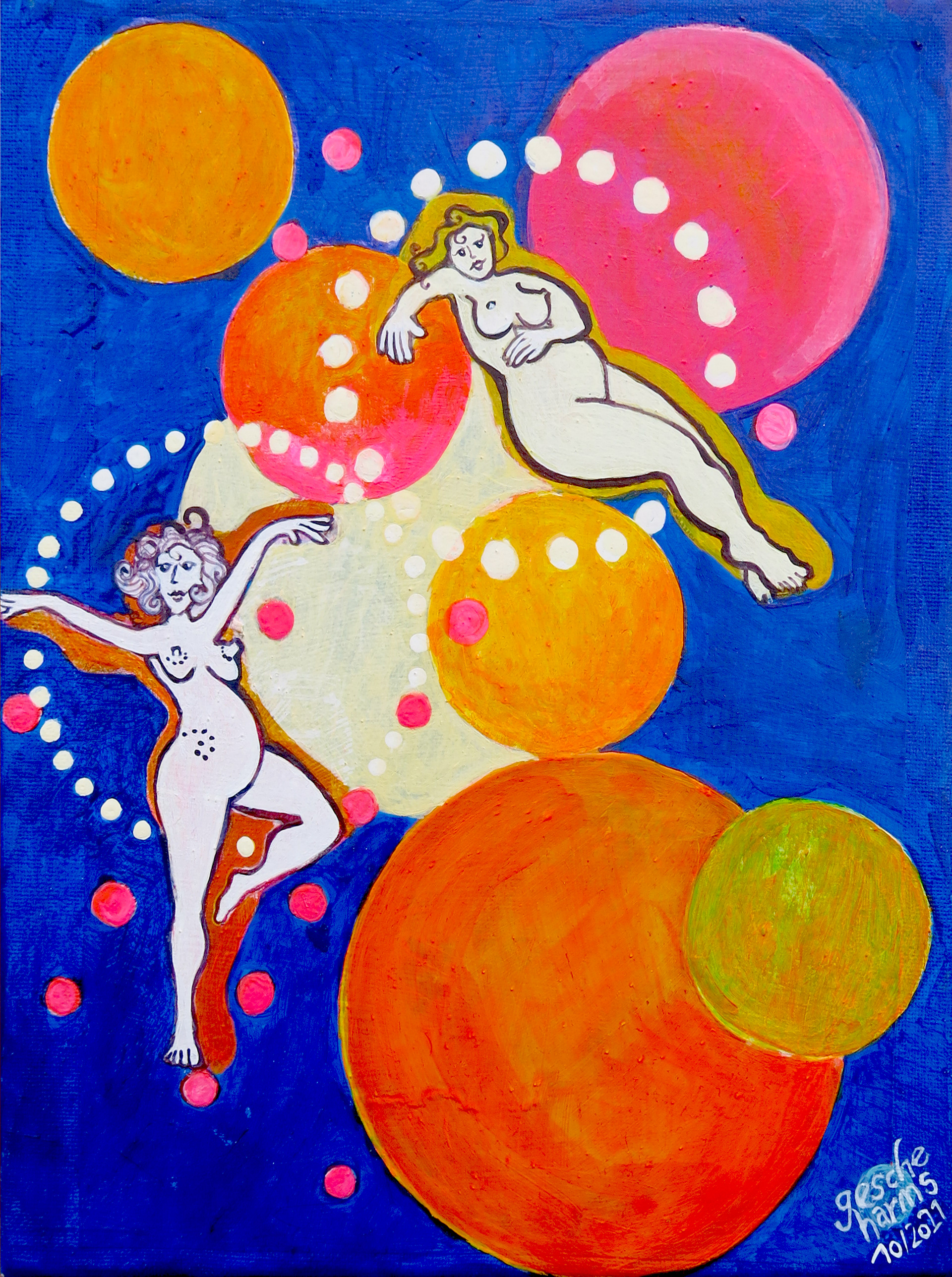 Jede Frau hat Ihre Ausstrahlung, eine Aura, nimmt mehr oder weniger Raum ein. Jede dieser persönlichen Sphären überschneidet sich in manchen Bereichen mit anderen und führt zu gegenseitiger Beeinflussung. Versuch einer Darstellung mit meinen Damen.